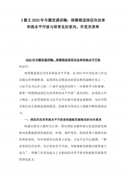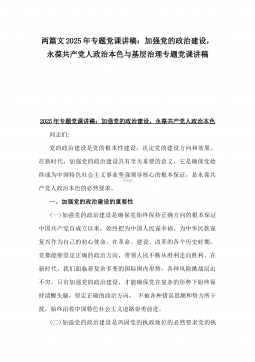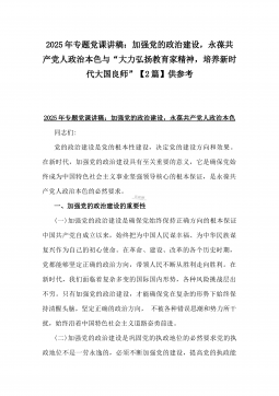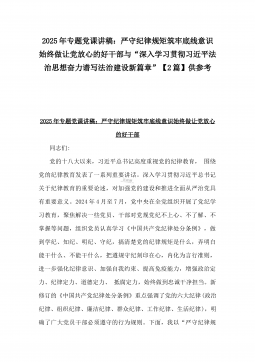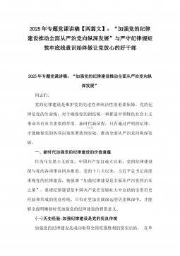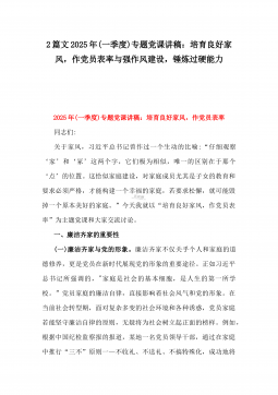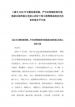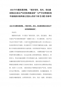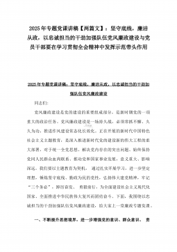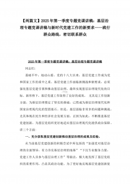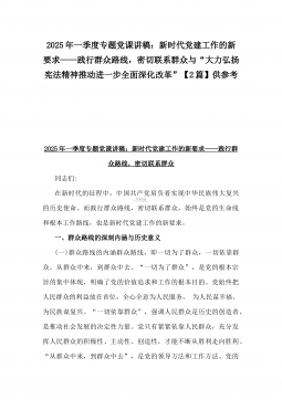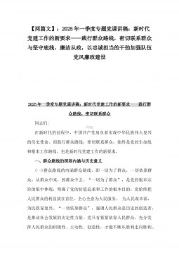 【两篇文】:2025年一季度专题党课讲稿:新时代党建工作的新要求——践行群众路线,密切联系群众与坚守底线,廉洁从政,以忠诚担当的干劲加强队伍党风廉政建设2025年一季度专题党课讲稿:新时代党建工作的新要求——践行群众路线,密切联系群众同志们:在新时代的征程中,中国共产党肩负着实现中华民族伟大复兴的历史使命。而践行群众路线,密切联系群众,始终是党的生命线和根本工作路线,也是新时代党建工作的新要求。一、群众路线的深刻内涵与历史意义(一)群众路线的内涵群众路线,即一切为了群众,一切依靠群众,从群众中来,到群众中去。“一切为了群众”,是党的根本宗旨的集中体现,明确了党的价值追求和工作的根本目的。党始终...