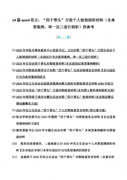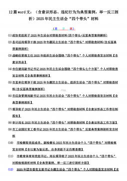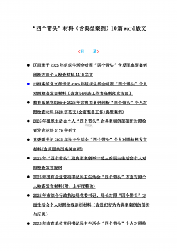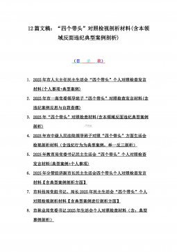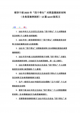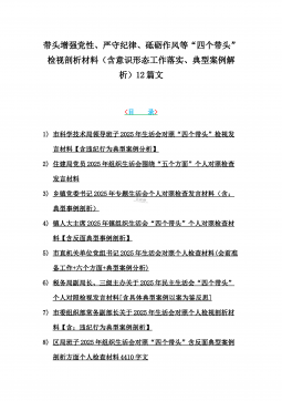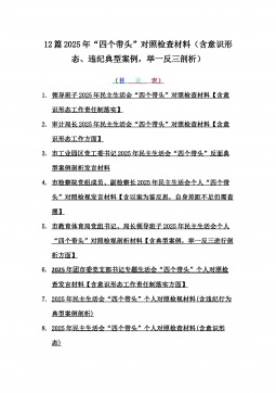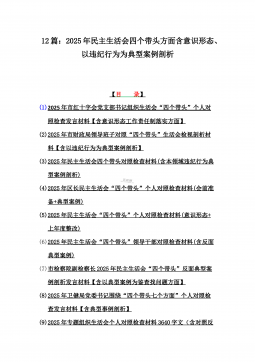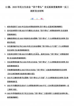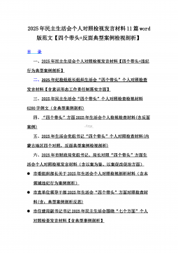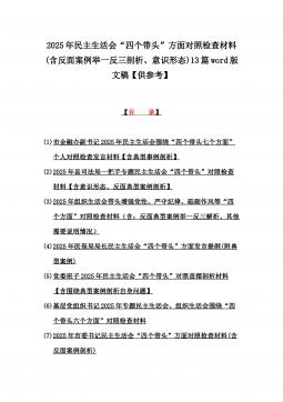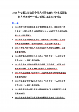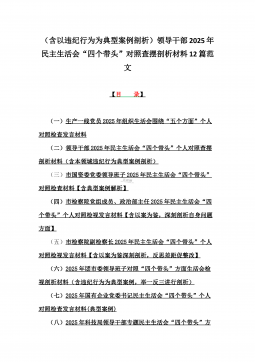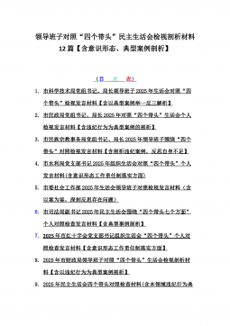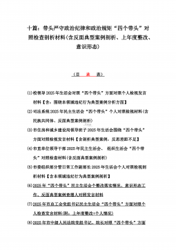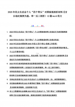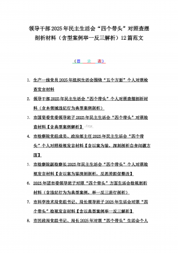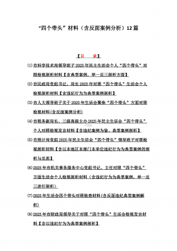 2025年民主生活会“四个带头”方面对照检查材料(含反面案例举一反三剖析、意识形态)13篇word版文稿【供参考】【目录】(1)市金融办副书记2025年民主生活会围绕“四个带头七个方面”个人对照检查发言材料【含典型事例剖析】(2)2025年县司法局一把手专题民主生活会“四个带头”对照检查材料【含意识形态、反面典型案例剖析】(3)2025年组织生活会带头增强党性、严守纪律、砥砺作风等“四个方面”对照检查材料(含:反面典型案例举一反三解析、其他需要说明情况)(4)2025年医保局局长民主生活会“四个带头”方面发言提纲(附典型案例)(5)党委班子2025年民主生活会“四个带头”对照查摆剖析材料【含围...
