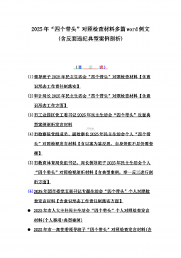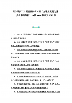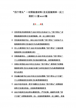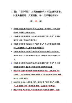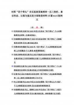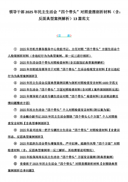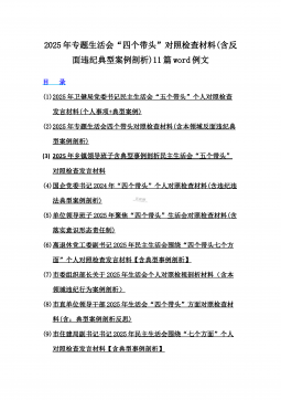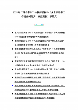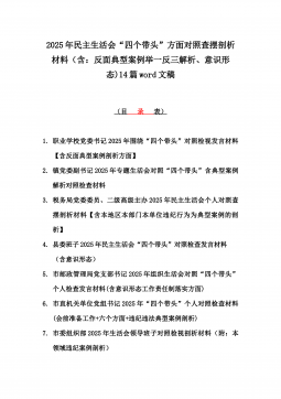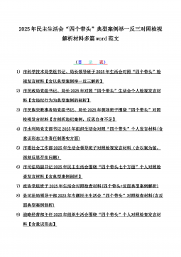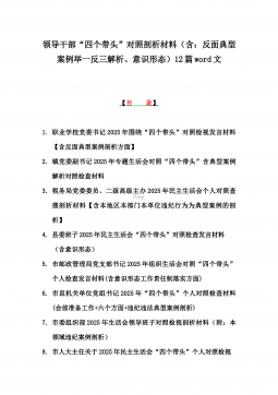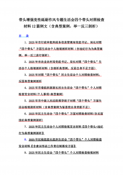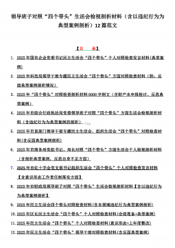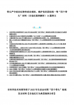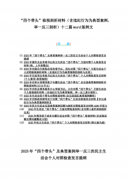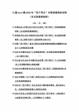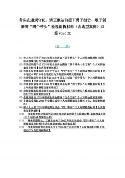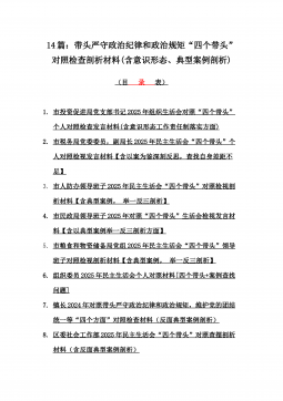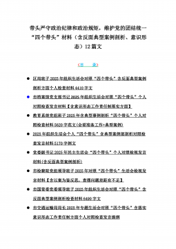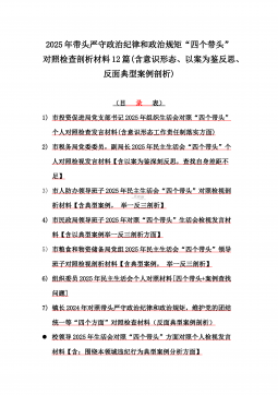 2025年带头严守政治纪律和政治规矩“四个带头”对照检查剖析材料12篇(含意识形态、以案为鉴反思、反面典型案例剖析)(目录表)1)市投资促进局党支部书记2025年组织生活会对照“四个带头”个人对照检查发言材料(含意识形态工作责任制落实方面)2)市税务局党委委员,副局长2025年民主生活会“四个带头”个人对照检视发言材料【含以案为鉴深刻反思,查找自身差距不足】3)市人防办领导班子2025年民主生活会“四个带头”对照检视剖析材料【含典型案例,举一反三剖析】4)市民政局领导班子2025年对照“四个带头”生活会检视发言材料【含以典型案例举一反三剖析方面】5)市粮食和物资储备局党组2025年民主生活会“...