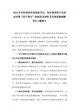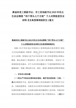 国有企业普通党员2025年围绕“四个方面”组织生活会个人对照检查发言材料与市住建局副书记“七个方面”个人对照检查发言材料【含典型事例剖析】2篇例文国有企业普通党员2025年围绕“四个方面”组织生活会个人对照检查发言材料根据Xx党支部召开2024年组织生活会的通知要求,我认真学习了党的二十届三中全会精神,深入学习了党规以及《中国共产党章程》《条例》《中国共产党支部工作条例(试行)》等党内法规,通过学习,我深刻认识到自身在思想、工作和作风等方面与党的要求还存在一定差距。现将个人对照检查情况汇报如下,不足之处,请同志们批评指正。一、存在的主要问题及表现(一)围绕严守政治纪律和政治规矩,维护党的团结统...