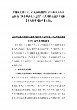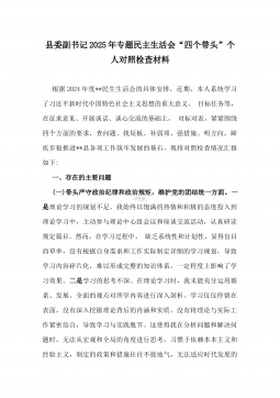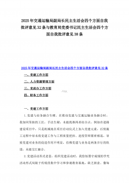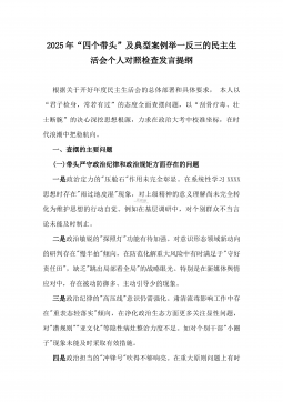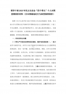 领导干部2025年民主生活会“四个带头”个人对照查摆剖析材料(含典型案例剖析)与国有企业党委书记民主生活会四个方面自我批评意见40条领导干部2025年民主生活会“四个带头”个人对照查摆剖析材料(含本领城违纪行为典型案例剖析)按照《关于认真开好2024年度民主生活会的通知》要求,本人深入学习贯彻习近平新时代中国特色社会主义思想和党的二十届三中全会精神,在认真开展理论学习、深入谈心谈话的基础上,全面对照4个方面内容,认真检视自身存在的问题和不足,深刻剖析问题根源,研究制定整改措施。现将对照检查情况汇报如下:一、存在的突出问题(一)带头严守政治纪律和政治规矩,维护党的团结统一。一是理论学习深度不足。...