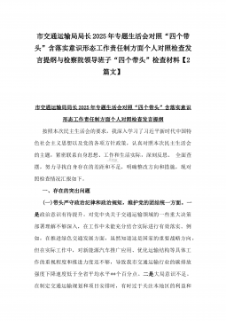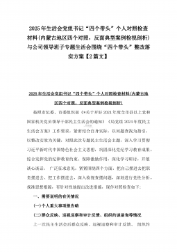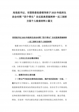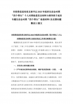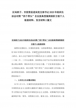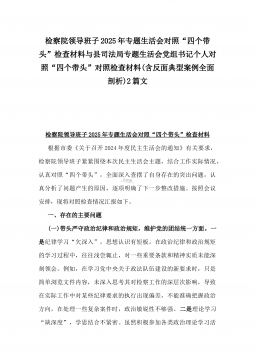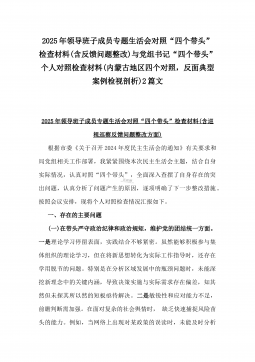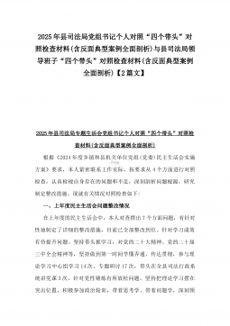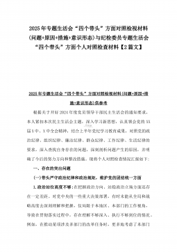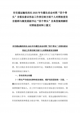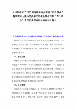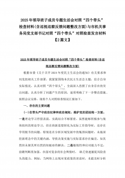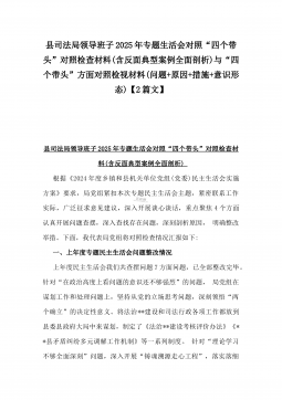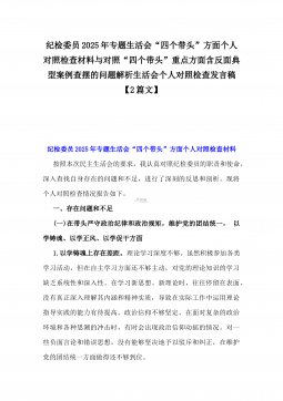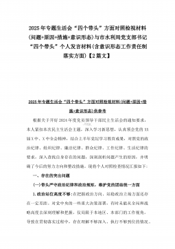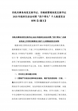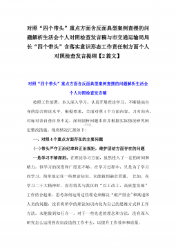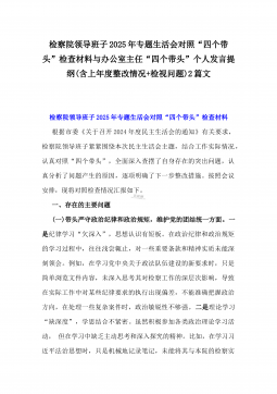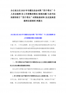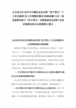 办公室主任2025年专题生活会对照“四个带头”个人发言提纲(含上年度整改情况+检视问题)与市一高党委领导班子“四个带头”对照检查发言材料(含违纪案例反思与自我查摆)2篇文办公室主任2025年专题生活会对照“四个带头”个人发言提纲(含上年度整改情况+检视问题)按照这次专题民主生活会要求,会前我认真学习党的二十大和二十届二中、三中全会精神,深入学习领会党章党规党纪和习近平总书记关于加强党的自我革命的重要论述和系列最新重要讲话精神,为开好这次民主生活会奠定坚实的思想基础。对照本次民主生活会主题,深入查找存在的主要问题,深刻剖析思想根源,进一步明确了整改方向。现将有关情况对照检查如下:一、学习贯彻习近...