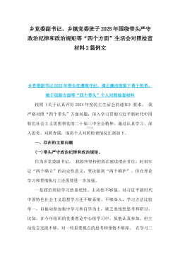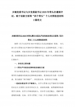 2025年镇长“四个带头”对照检查材料与乡镇领导班子“五个带头”对照检查发言材料2篇文(均含反面典型案例剖析)镇长2024年对照带头严守政治纪律和政治规矩,维护党的团结统一等“四个方面”对照检查材料(反面典型案例剖析)按照开好2024年度民主生活会的安排部署,会前,本人通过中心组集体学习、集中研讨、个人自学等方式,深入学习习近平总书记重要讲话重要指示精神,系统研读党章、《中国共产党纪律处分条例》等党内法规,深刻领会进一步全面深化改革的重大意义和战略部署,紧密联系工作实际,广泛征求意见、开展谈心谈话,对照“带头严守政治纪律和政治规矩,维护党的团结统一;带头增强党性、严守纪律、砥砺作风;带头在遵规...