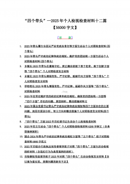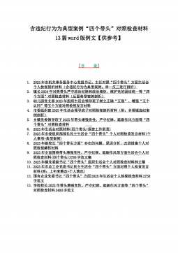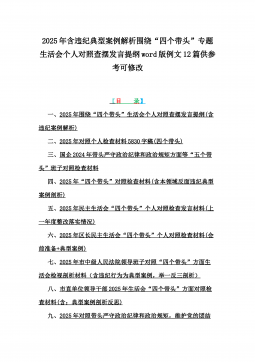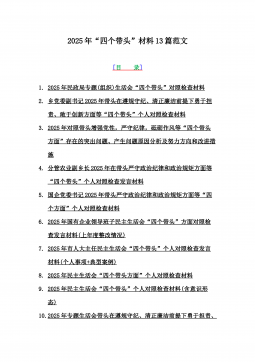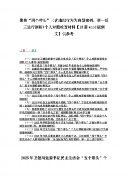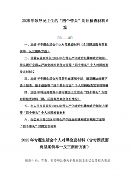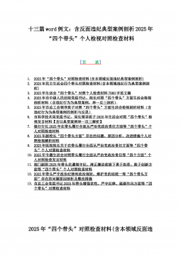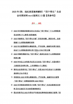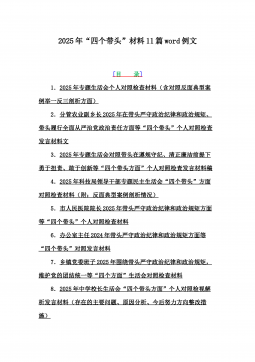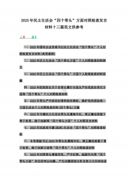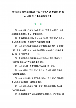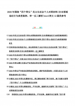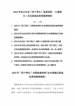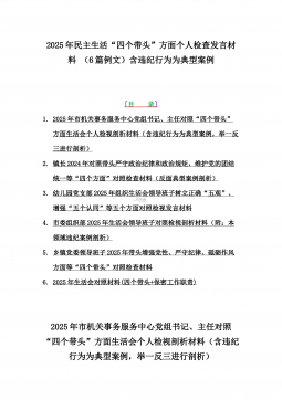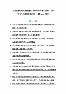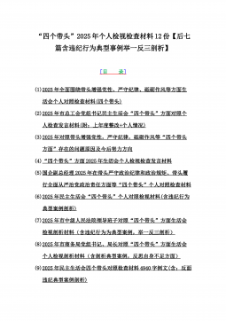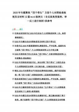 2025年专题聚焦“四个带头”方面个人对照检查检视发言材料12篇word版例文(含反面典型案例,举一反三进行剖析)供参考【目录】(1)市林业局党委书记2025年生活会个人对照检查材料(含:典型事例剖析)(2)2025年专题生活会对照检查发言材料【四个带头】(3)市委书记2025年紧紧围绕带头增强党性、严守纪律、砥砺作风方面等“四个带头”个人对照检查材料4170字范文稿(4)2025年领导班子民主生活会“四个带头”方面对照检查材料(上年度整改+准备情况)(5)2025年市财政局党组书记、局长对照“四个带头”方面生活会个人对照检视发言材料(含以案为鉴、以案促改促治方面)(6)镇长2024年对照带头...