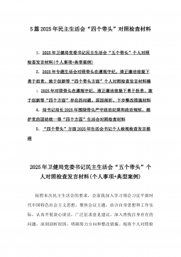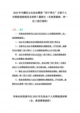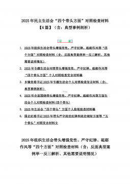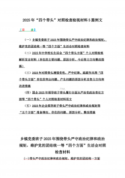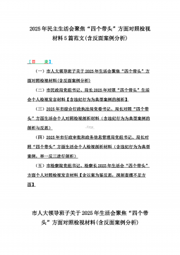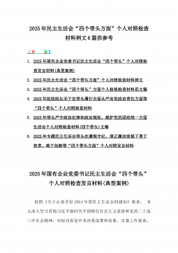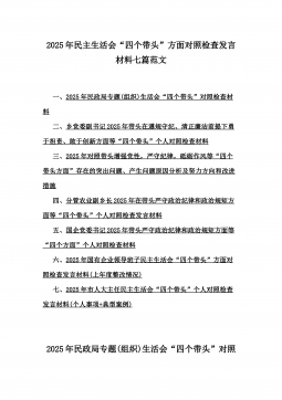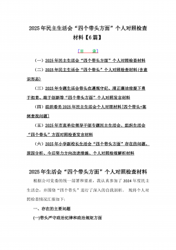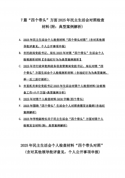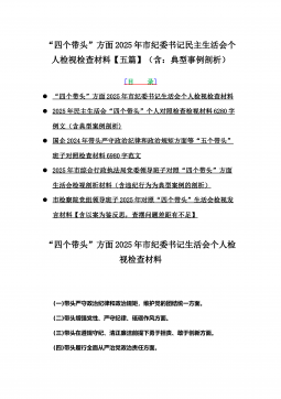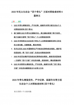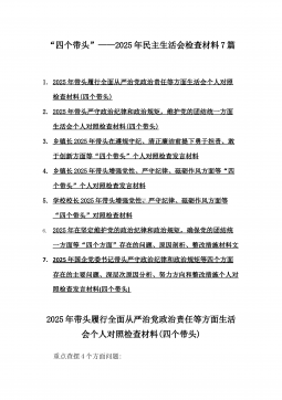 2025年民主生活会聚焦“四个带头”方面个人对照检查检视材料7篇例文(含违纪行为为典型案例,举一反三进行剖析)【目录】一、2025年民主生活会“四个带头”个人对照检查检视材料(含典型案例剖析)二、2025年市总工会领导班子对照“四个带头”方面生活会检视剖析材料(含违纪行为为典型案例的剖析与反思)三、县委常委班子2025年专题生活会带头严守政治纪律和政治规矩,维护党的团结统一等“四个带头方面”对照检查材料6330字文稿四、2025年市农业农村局党组书记、局长对照“四个带头”生活会个人检视剖析材料(含剖析典型例,反思自身不足方面)五、2025年学校副校长关于民主生活会“四个带头”方面对照个人检视发...