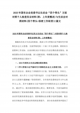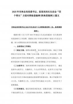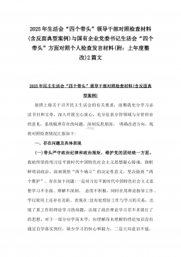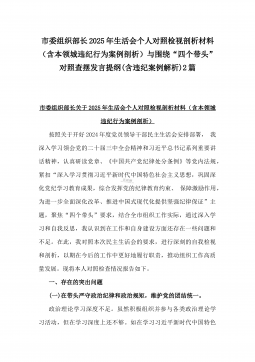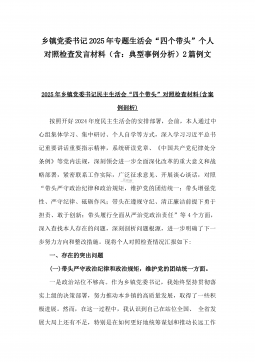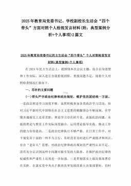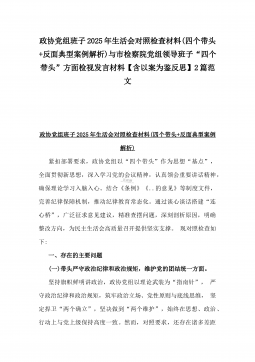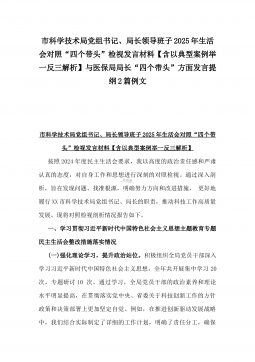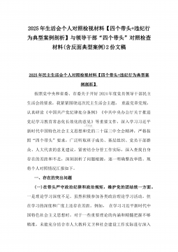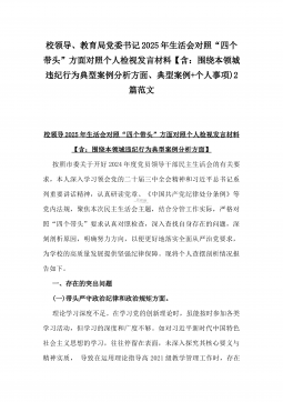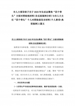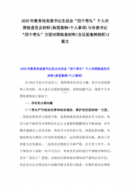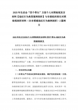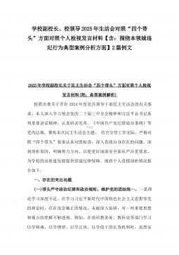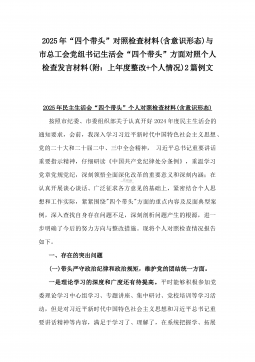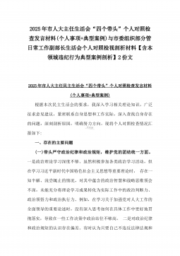 2025年“四个带头”个人对照检查发言材料(上一年度整改落实情况)与市检察院党组书记、检察长生活会“四个带头”方面个人对照检视发言材料【含以案为鉴反思】2篇文2025年民主生活会“四个带头”个人对照检查发言材料(上一年度整改落实情况)根据上级关于召开2024年专题民主生活会的通知安排,会前,我认真学习习近平新时代中国特色社会主义思想和党的二十届三中全会精神,系统学习习近平总书记关于全面从严治党、党的自我革命及对对管党治党工作的一系列重要指示批示精神,对照反面典型案例深入开展剖析,与班子成员、党支部党员代表进行谈心谈话,广泛听取各级各部门的意见建议。在此基础上,严格对照“四个带头”,紧密联系思想...
