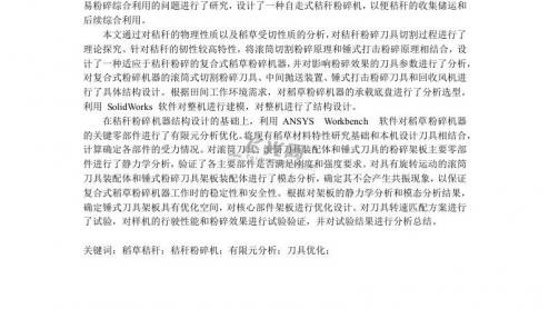 I题目小型谷子脱粒机的结构设计II中文摘要目前,国内大部分粮食脱粒设备仍以撞击脱粒为主,导致脱粒过程中的破碎率很高,严重影响了粮食的生产和经济效益。因此,开发出一种适用于粮食生产的新型脱粒机械,经过相互挤压,最后使谷子粒脱粒,从而达到谷子脱粒的目的。由于挤压法对籽粒的冲击很小,而且对籽粒的损伤也较小,因此,挤压法的脱粒效果较好,优于常规脱粒法。在设计过程中,以Pro/E为主要工具,利用ANSYS分析了在脱粒过程中,各刀片齿片在不同角度下的受力情况,并据此设计了一款新型的脱粒设备。关键词:谷子;脱粒机;设计;ANSYSIIIAbstractAtpresent,mostofthedomesticg...