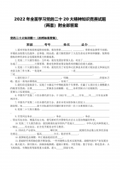 2022年学习党的二十20大报告精神应知应会知识竞赛测试题(二份)内附全部标准答案知识竞赛测试题一姓名:部门:分数:一、填空题(2×15=30分)1.()是社会主义民主政治的本质属性,是最广泛、最真实、最管用的民主。2.全党同志务必不忘初心、(),务必谦虚谨慎、艰苦奋斗,务必敢于斗争、(),坚定历史自信,增强历史主动,谱写新时代中国特色社会主义更加绚丽的华章。3.经过不懈努力,党找到了()这一跳出治乱兴衰历史周期率的第二个答案,确保党永远不变质、不变色、不变味。4.实践告诉我们,中国共产党为什么能,中国特色社会主义为什么好,归根到底是马克思主义行,是()的马克思主义行。5.国家安全是民族复兴的...