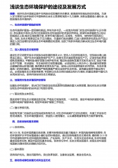 浅谈生态环境保护的途径及发展方式摘要:良好生态环境是实现中华民族永续发展的内在要求,是增进民生福祉的优先领域。为深入学习贯彻习近平新时代中国特色社会主义思想和党的十九大精神,决胜全面建成小康社会,全面加强生态环境保护。一、生态环境保护面临的形势生态环境保护面临一定困难和挑战,存在许多不足。一些地方和部门对生态环境保护认识不到位,责任落实不到位;经济社会发展同生态环境保护的矛盾仍然突出,资源环境承载能力已经达族接近上限;城乡区域统筹不够,新老环境问题交织,区域性、布局性、结构性环境风险凸显。当前,生态文明建设正处于压力叠加、负重前行的关键期,已进入提供更多优质生态产品以满足人民日益增长的优美生态...