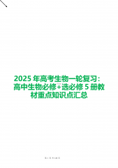 第1页共128页2025年高考生物一轮复习:高中生物必修+选必修5册教材重点知识点汇总第2页共128页必修一第1章走近细胞第1节 细胞是生命活动的基本单位1.细胞学说的建立过程时间科学家重要发展1543年比利时的维萨里、法国的比夏揭示了人体在器官和组织水平的结构1665年英国的罗伯特·虎克用显微镜观察植物木栓组织,发现并命名细胞19世纪德国的施莱登和施旺细胞是构成动植物体的基本单位1858年德国的魏尔肖细胞通过分裂产生新细胞2.细胞学说的内容(1)细胞是一个有机体,一切动植物都由细胞发育而来,并由细胞和细胞产物所构成。(2)细胞是一个相对独立的单位,既有它自己的生命,又对与其他细胞共同组成的整...