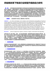 供给侧改革下物流行业转型升级的动力研究 摘 要: 供给侧结构性改革是我国为引领和适应经济发展的新常态而提出的创新举措。物流业作为基础性、战略性的服务业, 其转型升级对推动我国供给侧结构性改革具有重要意义。因此, 应借助供给侧的相关理论, 分析我国物流业发展面临的新形势, 在此基础上探索物流业转型升级的动力来源与优化路径。物流业转型升级过程中, 生产要素是基础, 制度要素是保障, 技术要素是关键。具体而言, 在生产要素方面, 要提高要素供给质量与供给效率, 为物流业转型升级打造坚实的基础;在制度要素方面, 政府和企业要创新服务模式, 提升管理能力, 同时政府要降低物流业发展中的制度性压力,...