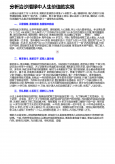 分析治沙播绿中人生价值的实现从事治沙造林工作30多年来,我和白芨滩防沙林场476名职工一起,播绿护绿,用心血和汗水给荒漠披绿装,“”实现了场子活、沙漠绿、职工富的奋斗目标,累计造林50多万亩,植树近1亿株,在浩瀚的毛乌素沙地西南缘构筑了一道绿色生态屏障。 一、不畏艰难, 勇挑重担, 在困境中前进林场地处沙漠深处,生存环境极为艰苦。建场初期,人心涣散,有2/3的人要求调走。林业事业费仅15万元,400名职工怎么养活?几十万亩林子怎么抚育?100多万亩沙漠怎么治理?面对重重困难,我们四处奔波,借款贷款,创办企业,发展多种经营,先后建起了机砖厂、预制厂、柳编厂、建筑工程队等10多个经营实体,每年创...