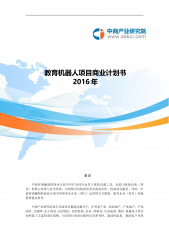 教育机器人项目商业计划书2016年前言中商咨询编制的商业计划书可作为项目运作主体的沟通工具,会着力体现企业(项目)的核心价值与竞争优势,有效吸引风险投资者及商业伙伴,促成项目融资。同时,中商咨询编制的商业计划书内容涉及企业(项目)运营的方方面面,能为企业(项目)实施提供建议参考。中商产业研究院每年完成项目数量达数百个,在养老产业、商业地产、产业地产、产业园区、互联网、电子商务、民营银行、民营医院、农业、养殖业、生态旅游、酒店、机械电子等行业积累了丰富的项目案例,可对同行业项目提供具有参考性、建设性意见,帮助客户对项目进行梳理和判断。【出版日期】2016年【交付方式】Email电子版/特快专递【...