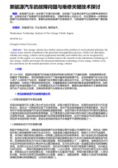 新能源汽车的故障问题与维修关键技术探讨 摘要:新能源汽车进一步改善了环境污染问题,但在推广与应用过程中也必须要考虑各种问题,这甚至决定了新能源汽车能否顺利普及,也能否获得人们的认可。对此需要进一步提高新能源汽车的维修技术研究,掌握先进的新能源汽车维修技术,为新能源汽车的顺利推广奠定基石。 关键词:新能源汽车;汽车发动机;维修技术;MaintenanceTechnologyAnalysisofNewEnergyVehicleEngineZHANGLeiChengduNormalUniversity Abstract:Newenergyvehicleshavefurtherimprovedthep...