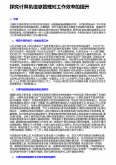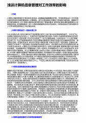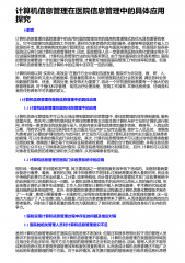 计算机信息管理在医院信息管理中的具体应用探究 0前言计算机信息管理在医院管理中的应用对医院管理效率的提高和管理模式的优化具有重要的意义。它不仅能够加快医院的工作效率,更好地为患者提供优质的服务,还能够帮助医院节省人力资源的开支,更加准确高效地进行管理活动,实现经济利益与医院形象的双收。但是现阶段很多医院还没有引进计算机信息管理技术,因此,医院管理人员一定要提高医院信息化管理应用水平,促进医院健康发展。计算机信息管理方法的应用逐渐普及,由于当前医院的业务逐渐增加,医院的管理也需要进一步加强计算机信息管理,才能更好地提高医院管理工作的效率和质量。但是计算机信息管理方法在计算机中的应用中还存在一定...