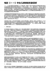 电影《一一》中女儿婷婷的形象赏析《一一》是台湾着名导演杨德昌2000年推出的一部影片,代表了他电影创作的最高成就,获得了当年戛纳电影节最佳导演奖.故事讲述了一家三代从童年、少年、青年到中年、老年五个年龄段不同的苦恼和困境.本文主要针对家庭中女儿婷婷的形象进行分析婷婷在影片开头舅舅的婚礼上就出场了,娇小柔弱、文静忧郁的样子和她那一身绣花的红色喜庆衣服显得不太搭配.婚礼的热闹氛围也没能感染她,她大多数时间是陪伴着婆婆.婚礼上云云阿姨的出现使婷婷疑惑,也让上了年纪的婆婆受到刺激,想提前回家.于是懂事的婷婷就照顾婆婆回家休息,在电梯门口碰到了刚搬进这栋大厦的蒋莉莉.莉莉和婷婷的年纪相仿,看上去活泼开朗...