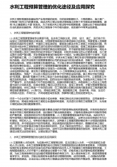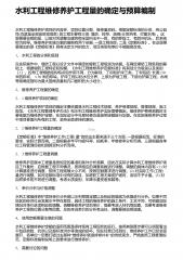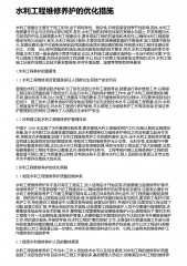 水利工程维修养护的优化措施水利工程建设主要在于施工阶段,由于其特殊性、复杂性,并很容易受到季节性影响,因此,水利工程质量往往会与这些特点密切相关.首先,水利工程的特殊性体现在其储水功能上,并发挥着挡水与泄洪的作用,这就需要水利工程建设中,要考虑到工程的抗腐蚀和承压性,以确保水利工程能够稳定而持久地运行.其次,水利工程设计复杂,主要体现在其筹建数量的不断增多,施工规模不断加大,在建设期间,就不可避免地受到自然因素和地质环境因素的影响.特别是水利工程往往建设在沿江、沿海、沿山等环境复杂的地段,因此而具有较高的技术要求.再次,水利工程建设的季节性很强.水利工程一般会选择少雨季节建设.比如,水利施工建...