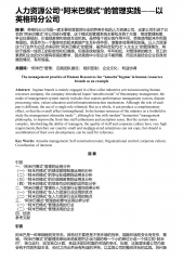 “”――人力资源公司阿米巴模式的管理实践以英格玛分公司摘要:英格玛分公司是一家主要经营蓝领行业的劳务外包的人力资源公司,这家公司引进了日“”本的阿米巴模式对公司进行管理,这个模式的管理系统主要包含四个方面:绩效管理制度、争议处理规则、价值观教育和信息互动机制。虽然每个部分的作用不同,单独使用起来作用是有限的。但是作为一个整体结合起来就能产生互补得作用,使整体效果得到加强。以人力资源“”“”这个行业作为立足点来研究阿米巴模式的管理,虽然符主代化人文主义的管理理念,有助于提高一线员工的积极性和归属感。但是系统较复杂,环环相扣,对管理者的能力,员工的素质和企业的文化都有很高的要求,因此我国中小型企业...