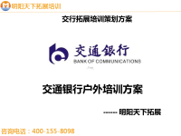 交行拓展培训策划方案交通银行户外培训方案------明阳天下拓展交行拓展培训策划方案目录目录课程设计课程设计项目介绍项目介绍活动预算活动预算师资力量师资力量成功案例成功案例关于明阳天下拓展关于明阳天下拓展培训流程培训流程基地介绍基地介绍交行拓展培训策划方案关于明阳天下拓展关于明阳天下拓展深圳唯一持牌彩弹枪射击训练基地;正规:深圳地区首家取得“户外训练中心”牌照的公司。彩弹:深圳地区唯一持牌彩弹枪射击训练的基地。师资:港澳台体验教育培训基地联盟,华南区体验教育培训旗舰,共享国际一流师资力量。基地:国内体验式培训联盟创始基地,国家中级拓展培训师指定培训基地,拥有一流的户外训练设施、完善的...
