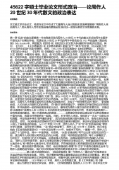 45622——字硕士毕业论文形式政治论周作人20世纪30年代散文的政治表达论文概述:本文是文学毕业论文,笔者在论文中引述了大量周作人自己的叙述,就是希望能够\"用周作人来说周作人\",即从周作人写作实践自身的逻辑出发,探讨这一实践与革命文学思潮的关系。论文正文:“”第一章乱世的政治逻辑第一节自我意识危机周作人20世纪30年代的散文形式和写作主题并不是在这个时期创作的,而是在他20世纪20年代的写作中隐含的在1923年的选集《我的花园》(MyGarden)中,两组题为《绿洲》和《茶话会》的文章大多由翻译片段和评论组成。其“”中,《沉沦》、《王尔德童话》和《你要去哪里》都是关于一种书的文章,可以说...