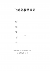飞鸿化妆品公司创业策划书制作者:*************2012年4月23日目录第一章,公司摘要第二章,公司简介第三章,营销策略第四章,竞争分析第五章,发展战略第六章,财务分析第七章,管理分析第八章,风险与机遇分析及规避措施第九章,总结第一章,公司摘要一,产品与服务:为客户提供化妆品类产品及使用指导二,资金需求:公司成立之初需人民币20万元三,筹资计划:资金由创始人和加盟者出及银行贷款两个方面获得四,市场分析:该行业已经趋于成熟,但发展潜力仍然巨大。初期竞争者主要是校园附近的小的此类商店,中期和后期竞争主要来自大公司的竞争。五,管理体系:分三层结构,并争取外部支持。六,销售及拓展策略:初期通...