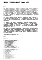 医院人力资源管理不足及有效对策摘要目前,医疗行业呈现多元化状态,医疗卫生服务向多层次方向发展,医院卫生人力资源将成为医院实现可持续发展的关键因素。Z医院作为河北省某高校附属医院,在多年的发展过程中,其人力资源管理问题逐渐成为医院实现进一步发展的关键问题。SWOT分析作为对医院未来发展具有较好规划功能的分析方法,能够有效指出医院未来的发展环境和存在的优势、劣势条件,以及机会和威胁因素。本文对Z医院的各因素展开分析,包括卫生人力资源的配置和结构,人才队伍建设,人才流失情况,找出存在的问题。分析其卫生人力资源在Z医院发展中的优势、劣势、机会和威胁,提出Z医院进一步加强卫生人力资源管理的战略选择,为Z...
