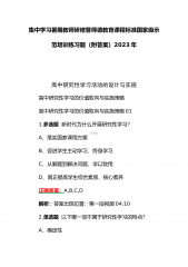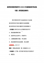 集中学习暑期教师研修暨师德教育课程标准国家级示范培训练习题(附答案)2023年高中研究性学习活动的设计与实施高中研究性学习的价值取向与实施策略高中研究性学习的价值取向与实施策略011.多选题新时代为什么开展研究性学习?A、落实国家课程方案B、促进学生主动学习、终身学习C、从解题到解决问题、学以致用D、真正提高学生综合素质、核心素养正确答案:A,B,C,D解析:答案出现位置:第一段视频04:102.单选题以下哪一项不属于研究性学习的特点?A、确定性B、开放性C、探究性D、实践性E、自主性F、生成性正确答案:A解析:研究性学习的首要特点是开放性,不局限于仅具有研究价值的问题。学生学习的目的在于解决...