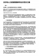 沃尔玛人力资源管理研究论文范文三篇 范文一 论文题目:从沃尔玛的利润分享谈企业人力资源管理摘要:企业如何在日趋激烈的市场竞争环境中增强竞争能力,关键是人,对人的管理是现代企业管理的特点之一。本文主要论述怎样从沃尔玛的利润分享这种较为重要的人力资源激励机制中获取企业人力资源管理方法。关键词:利润分享;沃尔玛;人力资源;管理企业如何在日趋激烈的市场竞争环境中增强竞争能力,关键是人,对人的管理也是现代企业管理的特点之一。企业怎样加强人力资源管理,单靠法律、法规和规章制度是不够的,必须以人为本,采取有效的人力资源激励机制来吸引人才,留住人才,充分调动每一个员工的积极性、创造性。本文主要从沃尔玛的利润...