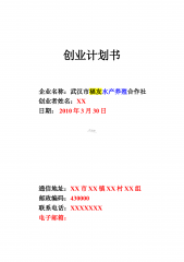 创业计划书企业名称:武汉市福友水产养殖合作社创业者姓名:XX日期:2010年3月30日通信地址:XX市XX镇XX村XX组邮政编码:430000联系电话:XXXXXXX电子邮箱:2目录一、摘要二、企业概况三、创业团队的介绍四、市场评估五、市场营销计划六、企业组织结构七、战略规划八、生产管理九、财务分析十、风险及对策3一、摘要武汉市福友水产养殖合作社是武汉市XX区首家水产养殖合作社。该社是在XX区委、区政府的关怀和相关部门的指导下,正式注册成立的。该社由渠文彬、胡金光、周涛、王书信、袁清科等5位多年从事水产养殖技术服务人员发起,筹资3.8万元,按照“入会自愿、退会自由”和“民建、民管、民受益”的原...