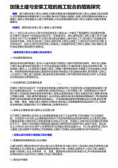 加强土建与安装工程的施工配合的措施探究 摘要:基于建筑安装工程与土建施工的配合管理,首先掌握建筑安装工程与土建施工配合的意义,其次掌握熟悉完善建筑施工设计图纸,强化技术措施,加强施工监管,采取防雷接地安装配合土建施工,通风工程安装配合土建工程等措施,从而全面阐述建筑安装工程与土建施工的配合管理重要性。 关键词:建筑安装,安装工程,土建施工,配合管理进入21世纪以来,社会主义现代化建设继续深入推进,进一步推动了我国建筑行业的蓬勃发展。由于建筑工程由多个内容组成,因此存在一定的复杂性。例如,建筑安装工程和土建工程,作为建设项目中必不可少的重要环节,必须在相互配合的基础上做好相关工作,目...