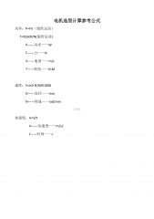 电机选型计算参考公式功率:P=FV(线性运动)T=9550P/N(旋转运动)P——功率——WF——力——NV——速度——m/sT——转矩——N.M速度:V=πDN/60X1000D——直径——mmN——转速——rad/min加速度:A=V/tA——加速度——m/s2t——时间——s力矩:T=FL惯性矩:T=JaL——力臂——mm(圆一般为节圆半径R)J——惯量——kg.m2a——角加速度——rad/s21.圆柱体转动惯量(齿轮、联轴节、丝杠、轴的转动惯量)J=MD28对于钢材:J=π×rD4L32g×10−30.78D4L×10−6(kgf⋅cm⋅s2)M-圆柱体质量(kg);D-圆柱体直径(...