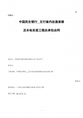 合同编号:中国民生银行支行室内改造装修及水电安装工程总承包合同发包人:中国民生银行股份有限公司广州分行承包人:工程名称:中国民生银行支行室内改造装修及水电安装工程程地点:签约地点:广州市天河区猎德大道68号民生大厦签订日期:20年月日1第一部协议书发包人(全称):中国民生银行股份有限公司广州分行承包人(全称):依照《中华人民共和国合同法》、《中华人民共和国建筑法》及其他有关法律、行政法规,遵循平等、自愿、公平和诚实信用的原则,双方就本建设工程施工事项协商一致,订立本合同。第一条 工程概况工程名称:中国民生银行支行装修及水电安装工程工程地点:工程内容:急灯、指示牌、电子设备和广告牌等的配电电源及...