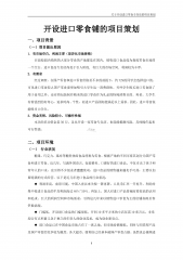 关于开设进口零食专卖店的项目策划开设进口零食铺的项目策划一、项目背景(一)项目提出原因1.有市场空白,利润丰厚(差异化市场营销)目前校园内销售的大部分零食的产地都是在国内,销售进口食品成为我校零食市场的一个空白。进口食品专卖店尚处于引入阶段,有巨大的市场空间,利润较为丰厚。2.有需求经过调查,在国产零食和进口零食价格差不多的前提下,约72%的同学会选择进口的。可见进口零食较之国产零食要更加吸引大学生这一消费群体。另外学生购买进口零食除了用于食用之外,还有将包装制作精美的进口零食作为礼品的特殊消费目的。再者,大学生有着强烈的好奇心,追求时尚、个性,而进口产品刚好能满足以上需求。因此,进口零食很能...