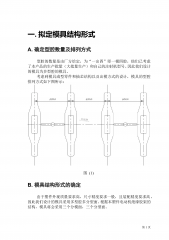 一.拟定模具结构形式A.确定型腔数量及排列方式型腔的数量是由厂方给定,为“一出四”即一模四腔,他们已考虑了本产品的生产批量(大批量生产)和自己的注射机型号。因此我们设计的模具为多型腔的模具。考虑到模具成型零件和抽芯结构以及出模方式的设计,模具的型腔排列方式如下图所示:图(1) B.模具结构形式的确定由于塑件外观质量要求高,尺寸精度要求一般,且装配精度要求高,因此我们设计的模具采用多型腔多分型面。根据本塑件电动机绝缘胶架的结构,模具将会采用三个分模面,三个分型面。第1页二.注射机型号的确定一般工厂的塑胶部都拥有从小到大各种型号的注射机。中等型号的占大部分,小型和大型的只占一小部分。所以我们不必过...