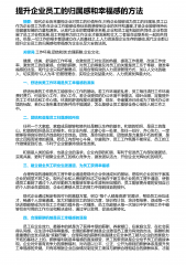 提升企业员工的归属感和幸福感的方法 摘要:现代企业历来重视企业对员工的价值所在,只有企业能够成为员工的归属地,员工以作为企业员工为荣,在企业工作能够设身处地的感受到企业的关怀和温暖,才是企业能够保持长效健康发展的力量和源泉。从现代企业的管理要求来看,企业和员工是利益的共同体,企业有发展了员工才会有发展,员工积极努力的工作企业才能发展和壮大,二者是命运联系在一起的共同体。但是,一切工作的根本都是建立在人的基础之上,人力资源是企业生存的基础,现代企业都以提升企业员工的归属感和幸福感为企业长足久安的法则。 关键词:工作环境;团结和谐;合理薪酬;企业文化; 健康、优美、舒适的工作环境,会激发员工...