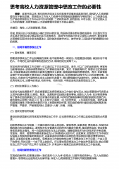 思考高校人力资源管理中思政工作的必要性 摘要:改革开放以来,我们的经济政治文化在取得举世瞩目成就的同时,高校的人力资源管理也在不断地发展。思想政治工作在人力资源中发挥着极其重要的作用的同时,人力资源也成为了高校思想政治工作中必不可少的因素,二者相互依存,相互影响,不可分割。本文试图从以人为本的角度,来思考高校人力资源管理中思政工作的必要性。关键词:高校;人力资源管理;思政;目前,我国正处于全面建成小康社会的决胜阶段,我国各项事业都在蓬勃发展中,无论是生活方式还是社会组织成分都呈现出多元化的特点。高校作为培养社会主义接班人的地方,要求教师必须能够在面对社会变化的基础上,适时的改变教学方法、教学...