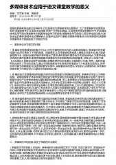 多媒体技术应用于语文课堂教学的意义来源:学术堂作者:周老师发布于:2014-10-08共2522字我国的素质教育实施已经有多年,已经逐渐成为课堂教学的主要模式.为了使课堂教学效果更加有效,多媒体技术正在逐渐走进课堂,受到广大师生的青睐.在信息技术高速发展的今天,把多媒体技术应用于语文课堂教学,对提高学生的学习积极性,增强学生学习的信心,吸引学生的注意力,激发学生的情感,提高学生的理解能力,挖掘学生的学习潜能,突破教学重难点,优化课堂结构,提高教学质量等多方面都起到了积极的作用.一、激发学生学习语文的兴趣1.多媒体凭借着其独特的魅力可以让学生在最短的时间内进入到教学情境中.教师制作的多媒体课件,...