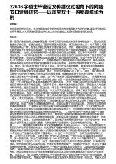 32636字硕士毕业论文传播仪式视角下的网络——节日营销研究以淘宝双十一购物嘉年华为例论文概述:本文是新闻媒体论文,本文将现实社会中的传播活动和传播现象作为研究对象,通过对网络节日的符号呈现,来认识网络节日是如何在意义共享的基础上实现对现实的表征和维系。论文正文:第一章简介最初的网上购物本质上是一场电子商务和传统实体店争夺市场的战斗,同时为消费者提供价格优势、便捷的送货上门服务和克服地区限制。除了这些优势之外,电子商务公司像传统的实体店一样,经常在节假日和季末开展促销活动。然而,随着同类网上购物平台的建立和同质营销方式导致的市场疲软,电子商务企业要想在网上营销中站稳脚跟,就需要走出传统营销的窠...