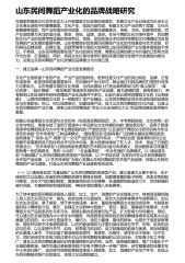 山东民间舞蹈产业化的品牌战略研究在国家把提高文化竞争软实力上升到国家文化政策的高度后,发展文化产业已经成为社会主义文化事业进程中的重要篇章。文化产业,就其内涵而言,有着文化与产业的两个层面,文化代表着精神层面,而产业则指向经济层面,文化层面传递着意识、传统、习俗、创意等信息,而产业层面更为关注的是市场、需求、供给、品牌、途径。在当今舞蹈文化市场环境中,民间舞蹈文化产业的发展带有显著的地域特征,挖掘、呈现和表达本地域传统舞蹈文化精髓成为区域性舞蹈产业发展的重要内容。山东有着良好的发展民间舞蹈产业化的市场基础与艺术资源,但因其在品牌选择、品牌打造、品牌营销等方面的欠缺导致山东民间舞蹈产业化整体面貌...