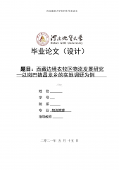河北地质大学本科生毕业论文毕业论文(设计)题目:西藏边境农牧区物流发展研究—以岗巴镇昌龙乡的实地调研为例姓名学号院系专业物流管理指导教师二零二一年五月十五日河北地质大学本科生毕业论文论文原创性声明本人所提交的论文,是在导师的指导下,独立进行研究工作所取得的原创性成果。除文中已经注明引用的内容外,本论文不包含任何其他个人或集体已经发表或撰写过的研究成果。对本文的研究做出重要贡献的个人和集体,均已在文中标明。本声明的法律后果由本人承担。论文作者(签名):指导教师确认(签名):年月日年月日论文版权使用授权书本论文作者完全了解河北地质大学有权保留并向国家有关部门或机构送交论文的复印件和磁盘,允许论文被...