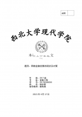 本科生毕业论文题目:网络金融发展的现状及对策年级:2017级专业:金融工程学号:201700280253姓名:杨亦蓉指导教师:魏希娟2021年4月17日成绩诚信声明本人郑重声明:本人所呈交的毕业论文(设计)是在导师的指导下独立进行研究所取得的成果。毕业论文(设计)中凡引用他人已经发表或未发表的成果、数据、观点等,均已明确注明出处。除文中已经注明引用的内容外,不包含任何其他个人或集体已经发表或在网上发表的论文。特此声明。论文作者签名:日期:2021年4月17日摘要随着网络金融的迅速发展,基于网络庞大的数据库和数据处理能力,网络为金融提供了无限发展和创新的可能。金融与网络的结合这种新型的金融服务模...