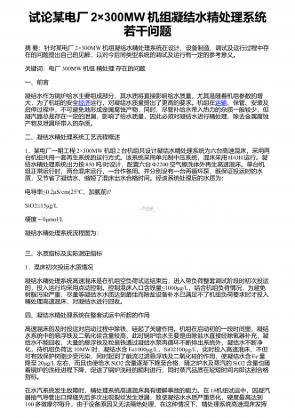 试论某电厂2×300MW机组凝结水精处理系统若干问题摘要:针对某电厂2×300MW机组凝结水精处理系统在设计、设备制造、调试及运行过程中存在的问题提出自己的见解,以对今后同类型系统的调试及运行有一定的参考意义。关键词:电厂300MW机组精处理存在的问题一、前言凝结水作为锅炉给水主要组成部分,其水质将直接影响给水质量,尤其是随着机组参数的增大,为了机组的安全经济运行,对凝结水质量提出了更高的要求。机组在运输、保管、安装及启停过程中,不可避免地形成金属腐蚀产物,同时,尽管补给水带入热力的杂质一般较少...