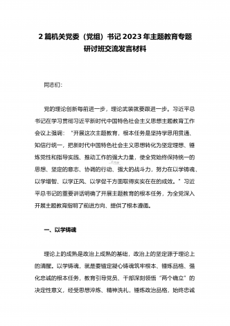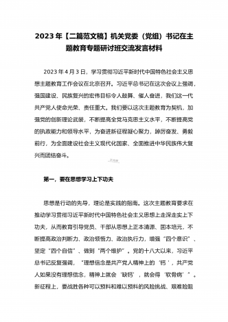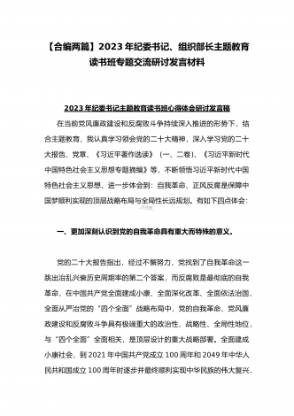 2023年宣传部长宣传干部、组织部长2023年主题教育读书班专题交流研讨发言材料【两篇文】2023年宣传部长宣传干部在主题教育读书班上的研讨发言稿这次集中学习,静下心来读习近平总书记的原文原著,学思悟结合,进一步深化了对习近平新时代中国特色社会主义思想的认识,主要在三个方面有了更深的感悟和体会。第一,更加深刻认识为什么我们党始终强调思想建党、理论强党。习近平总书记深刻指出,我们党之所以能够历经艰难困苦而不断发展壮大,很重要的一个原因就是始终重视思想建党、理论强党,使全党始终保持统一的思想、坚定的...