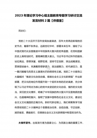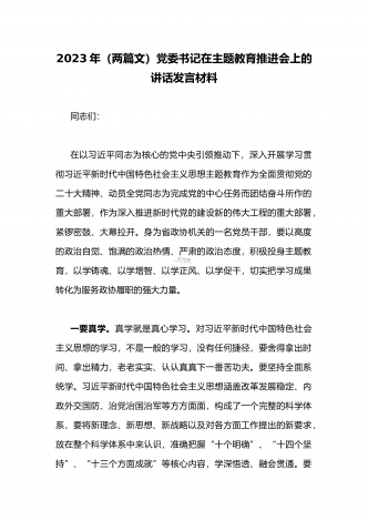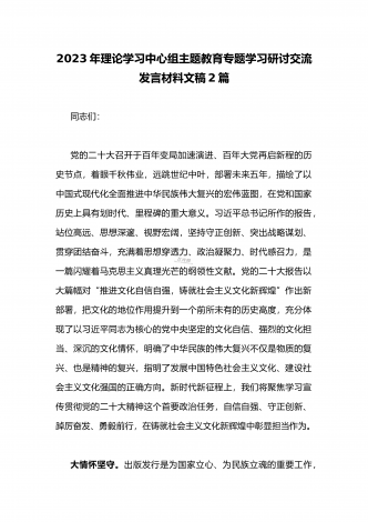 国企党委书记领导干部2023年主题教育读书班专题研讨发言材料二篇稿(供参考)同志们:以县处级以上领导干部为重点在全党深入开展学习贯彻习近平新时代中国特色社会主义思想主题教育,是贯彻落实党的二十大精神的重大举措。4月3日,中央学习贯彻习近平新时代中国特色社会主义思想主题教育工作会议召开,习近平总书记做了重要讲话。2023年是全面贯彻党的二十大精神开局之年,这也是集团公司深化改革发展的关键之年,抓好党的建设任务艰巨,主题教育正当其时,意义重大。今天集团召开关于学习贯彻习近平新时代中国特色社会主义思想...