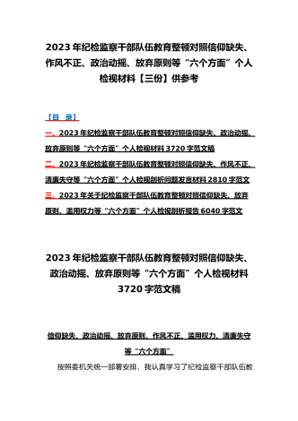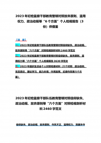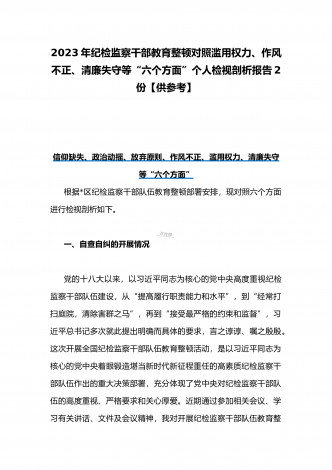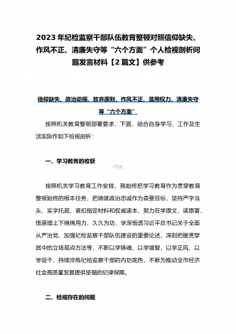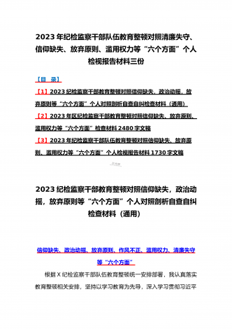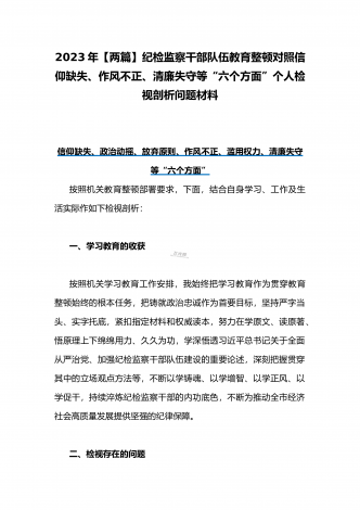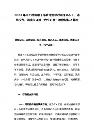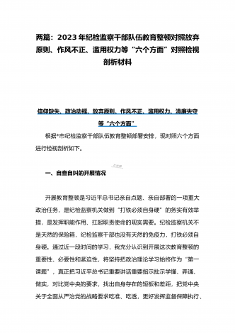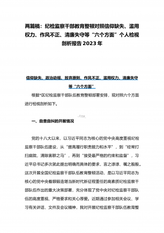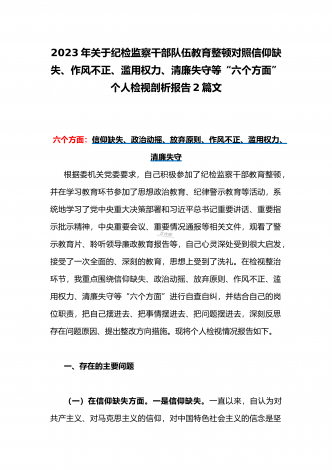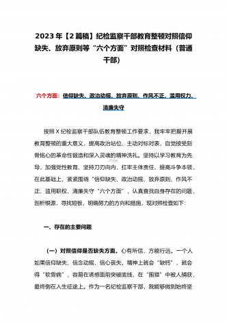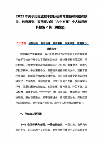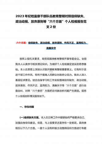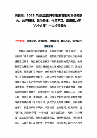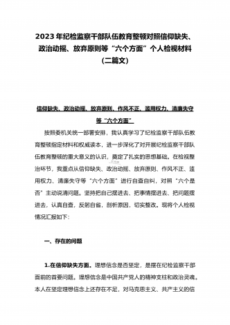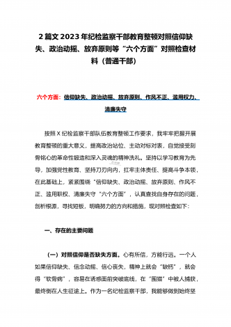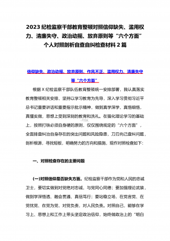 2023纪检监察干部教育整顿对照信仰缺失、滥用权力、清廉失守、政治动摇、放弃原则等“六个方面”个人对照剖析自查自纠检查材料2篇