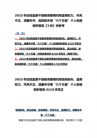 2023纪检监察干部教育整顿对照信仰缺失、滥用权力、清廉失守、政治动摇、放弃原则等“六个方面”个人对照剖析自查自纠检查材料2篇信仰缺失、政治动摇、放弃原则、作风不正、滥用权力、清廉失守等“六个方面”根据X纪检监察干部队伍教育整顿统一安排部署,我认真落实教育整顿相关安排,坚持以学习教育为先导,深入学习贯彻习近平总书记重要讲话和重要指示批示精神,做到真学深学,真悟细悟,真懂实做,思想上受到深刻的教育和洗礼。在强化理论学习的基础上,按照打铁必须自身硬的原则,仅仅围绕规定的“六个方面”,全面排查纠治自身...