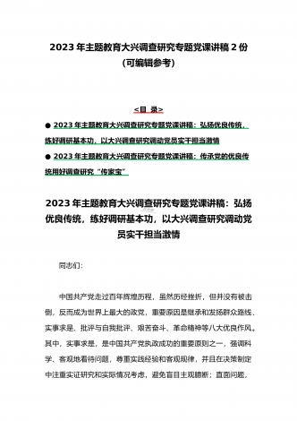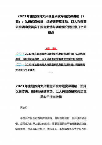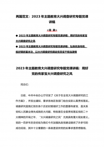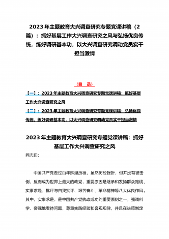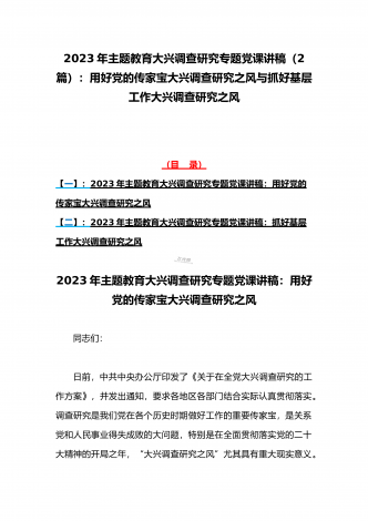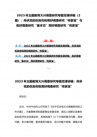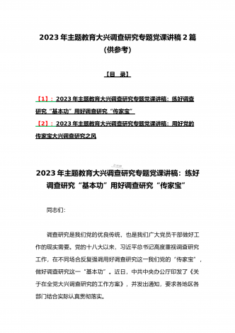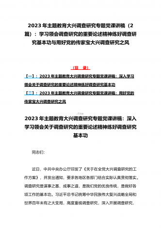 2023年主题教育大兴调查研究专题党课讲稿(2篇):练好调查研究“基本功”用好调查研究“传家宝”与深入学习领会关于调查研究的重要论述精神练好调查研究基本功