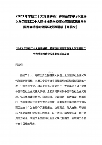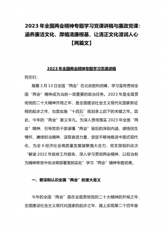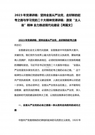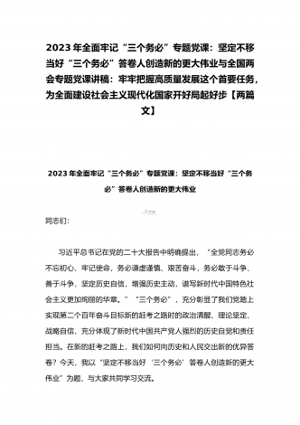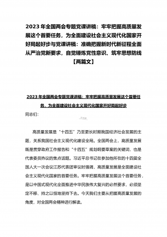 2023年全国两会专题党课讲稿:牢牢把握高质量发展这个首要任务,为全面建设社会主义现代化国家开好局起好步与党课讲稿:准确把握新时代新征程全面从严治党新要求,自觉锤炼党性意识、筑牢思想防线【两篇文】
