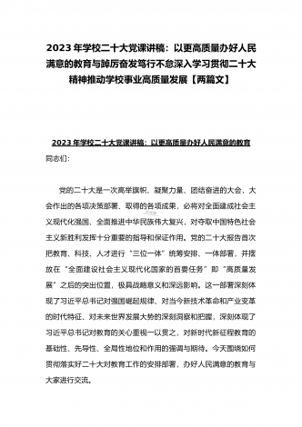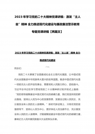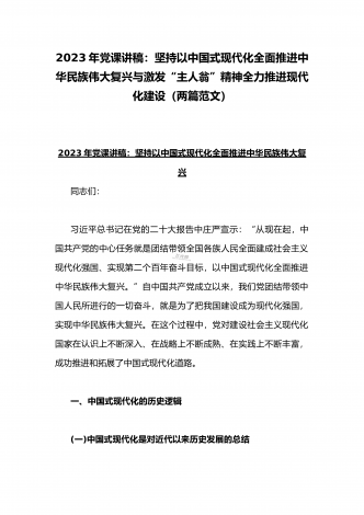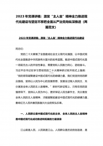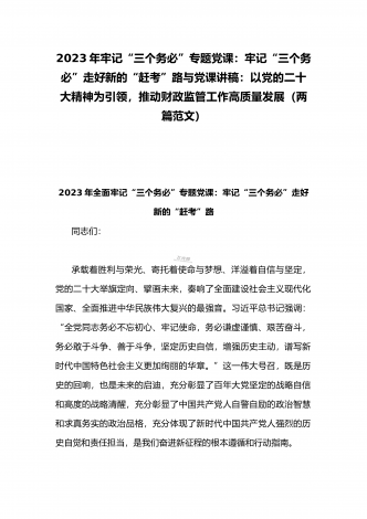 2023年全国两会专题党课讲稿:牢牢把握高质量发展这个首要任务,为全面建设社会主义现代化国家开好局起好步与党课讲稿:准确把握新时代新征程全面从严治党新要求,自觉锤炼党性意识、筑牢思想防线【两篇文】2023年全国两会专题党课讲稿:牢牢把握高质量发展这个首要任务,为全面建设社会主义现代化国家开好局起好步同志们:高质量发展是“十四五”乃至更长时期我国经济社会发展的主题,关系我国社会主义现代化建设全局。全国两会上,高质量发展既是贯穿政府工作报告和“十四五”规划纲要草案的关键词,也是代表委员热议的焦点话题...
