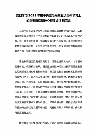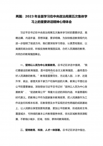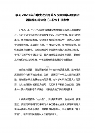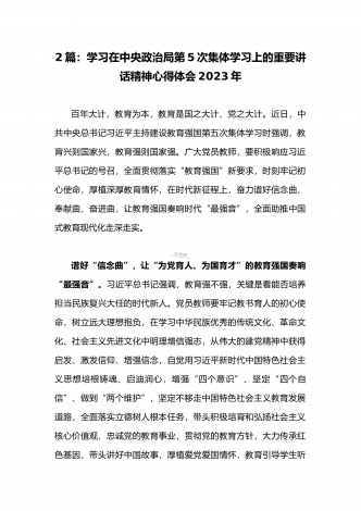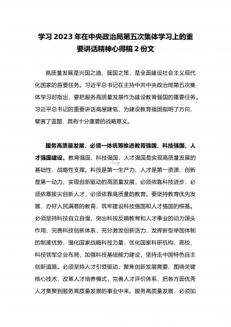 全面学习2023年在中央政治局第五次集体学习上的重要讲话精神心得体会【二份文】高质量发展是兴国之道、强国之策,是全面建设社会主义现代化国家的首要任务。习近平总书记在主持中共中央政治局第五次集体学习时指出,要把服务高质量发展作为建设教育强国的重要任务。习近平总书记的重要讲话高屋建瓴,为建设教育强国指明了方向,擘画了蓝图,具有十分重要的战略意义。服务高质量发展,必须一体统筹推进教育强国、科技强国、人才强国建设。教育强国、科技强国、人才强国是实现高质量发展的基础性、战略性支撑。科技是第一生产力、人才是...